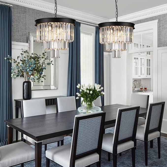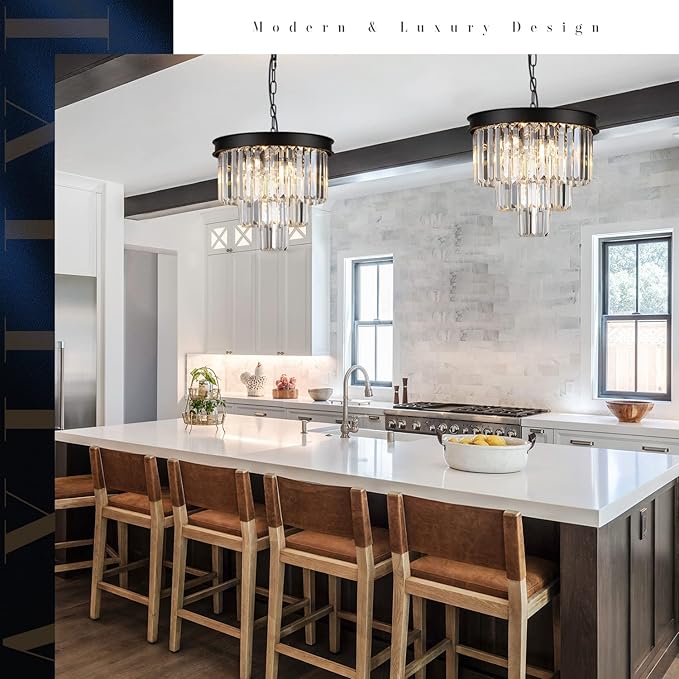 - 【DIMENSION】This round crystal chandelier is W 15.5” and H13” with adjustable chain, it can be adjusted to maximum 35.5”; by changing the length of the chain, it can be easily adapted to different space in your home, perfectly fits on high ceiling or lower ceiling, Please noted that this crystal chandelier is a small version in this series of black chandeliers