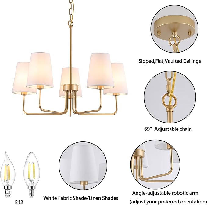 - 🌞Farmhouse design:The industrial style golden robotic arm chandelier has five white fabric shade, the golden farmhouse chandelier can create a warm atmosphere, the light of the golden chandelier will not dazzle your eyes, and the color of the lampshade will change with the color of your light! It\’s so beautiful!