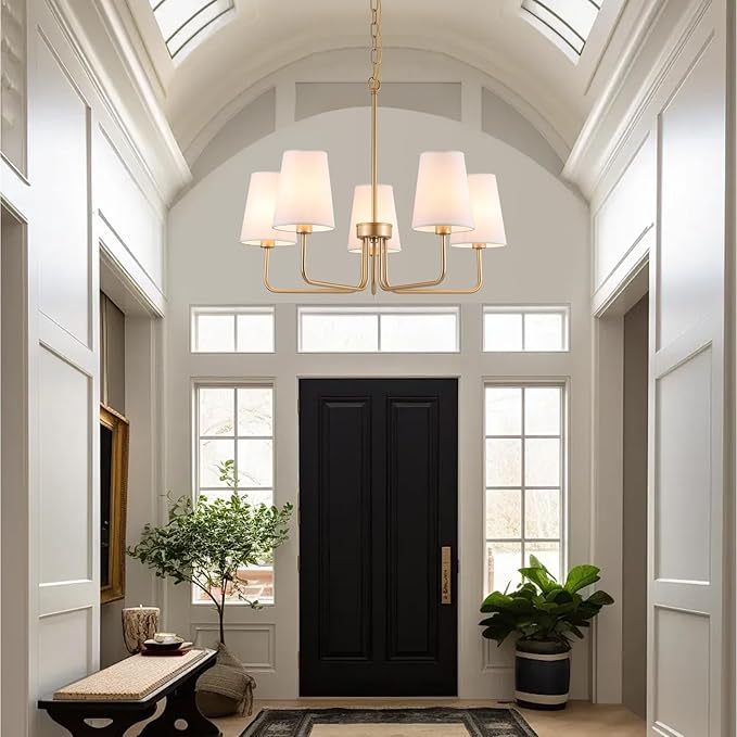 AMZASA Farmhouse Chandelier, 5-Lights Visual Comfort Gold Light, Muted Gold with White Fabric Shade, Linear Island Lighting Fixture for Kitchen, Dining Room