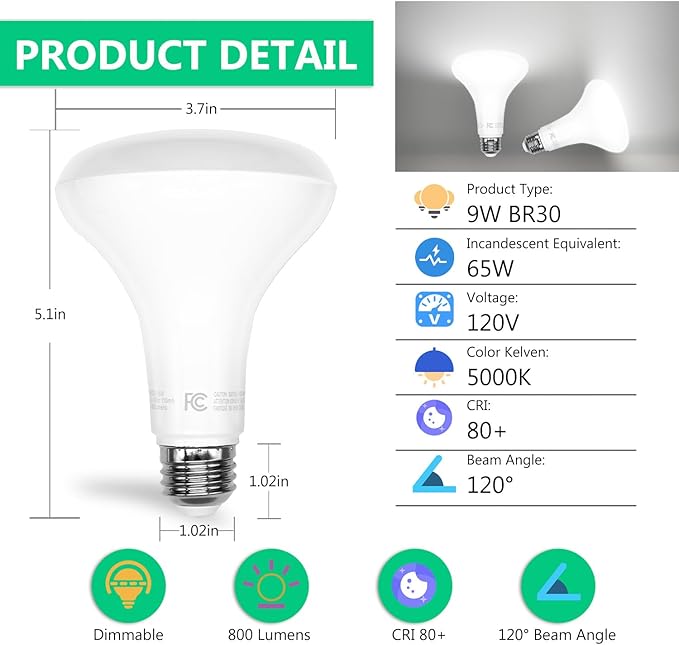 - Dimming 5000K BR30 LED Bulb: The dimmable feature of the BR30 light bulbs are 5000K and 65 W Equivalent, allow you to adjust the brightness to your liking, and the 120-degree light angle helps you create the perfect level of brightness for any ambiance or decoration