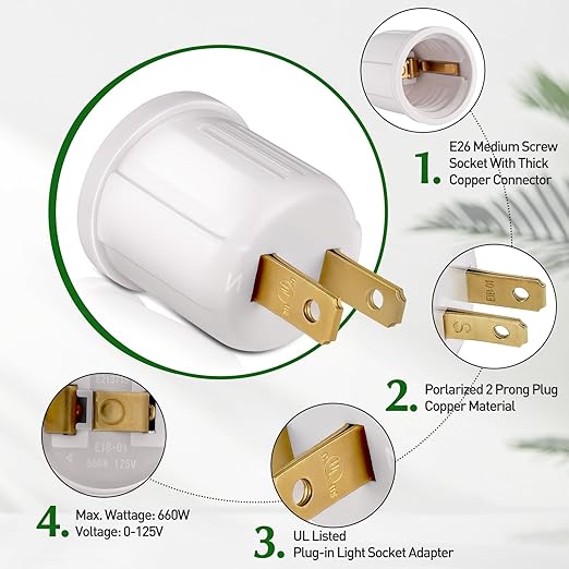 Outlet to Socket Adapter, Plug-in Light Socket, Convert Outlet to Light Bulb Socket, Polarized 2-Prong Outlet to E26 E27 Screw Base Bulb Socket, 660 Watt, 125 Volt, UL Listed (4-Pack)