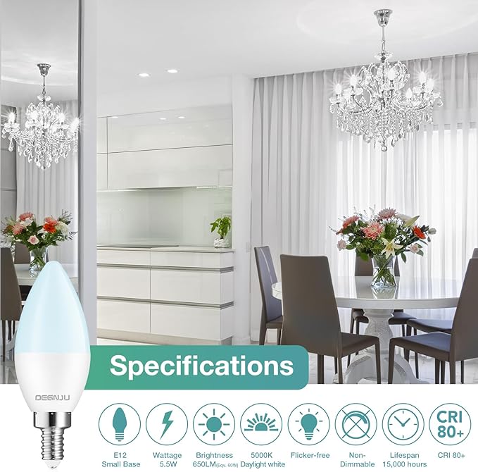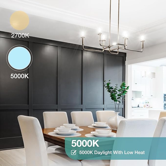 - Bright and Gentle Light: Our candelabra led light bulbs offer 650 lumen high brightness to light up your space while maintaining a 5000K daylight white, eye-friendly glow. Perfect for creating a well-lit yet relaxing atmosphere in any room