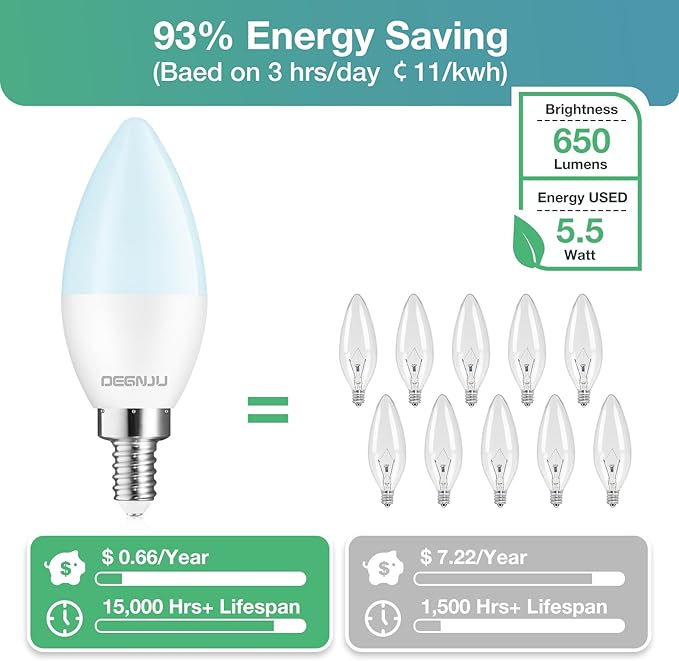 - Energy Efficient: These chandelier light bulbs can replace 60W incandescent bulbs with only 5.5W used, saving up to 90% on energy costs. And its lifespan is over 15,000 hours, which can largely reduce replacement frequency, making it an ideal choice for home lighting