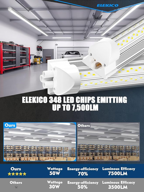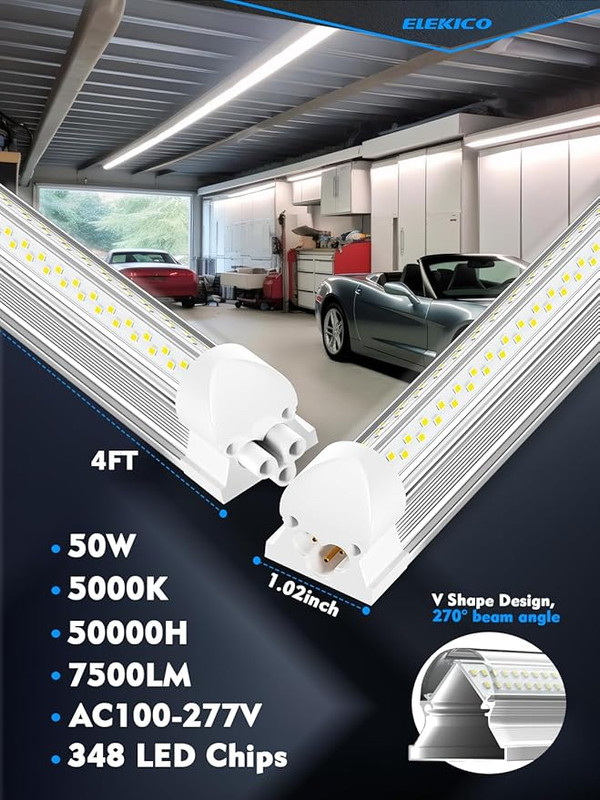 - High Brightness Lighting—This 50W 4FT LED shop light comes with high output 7500LM, 384pcs LED Chips, V-shape 270 degree lighting, 150lm/w.